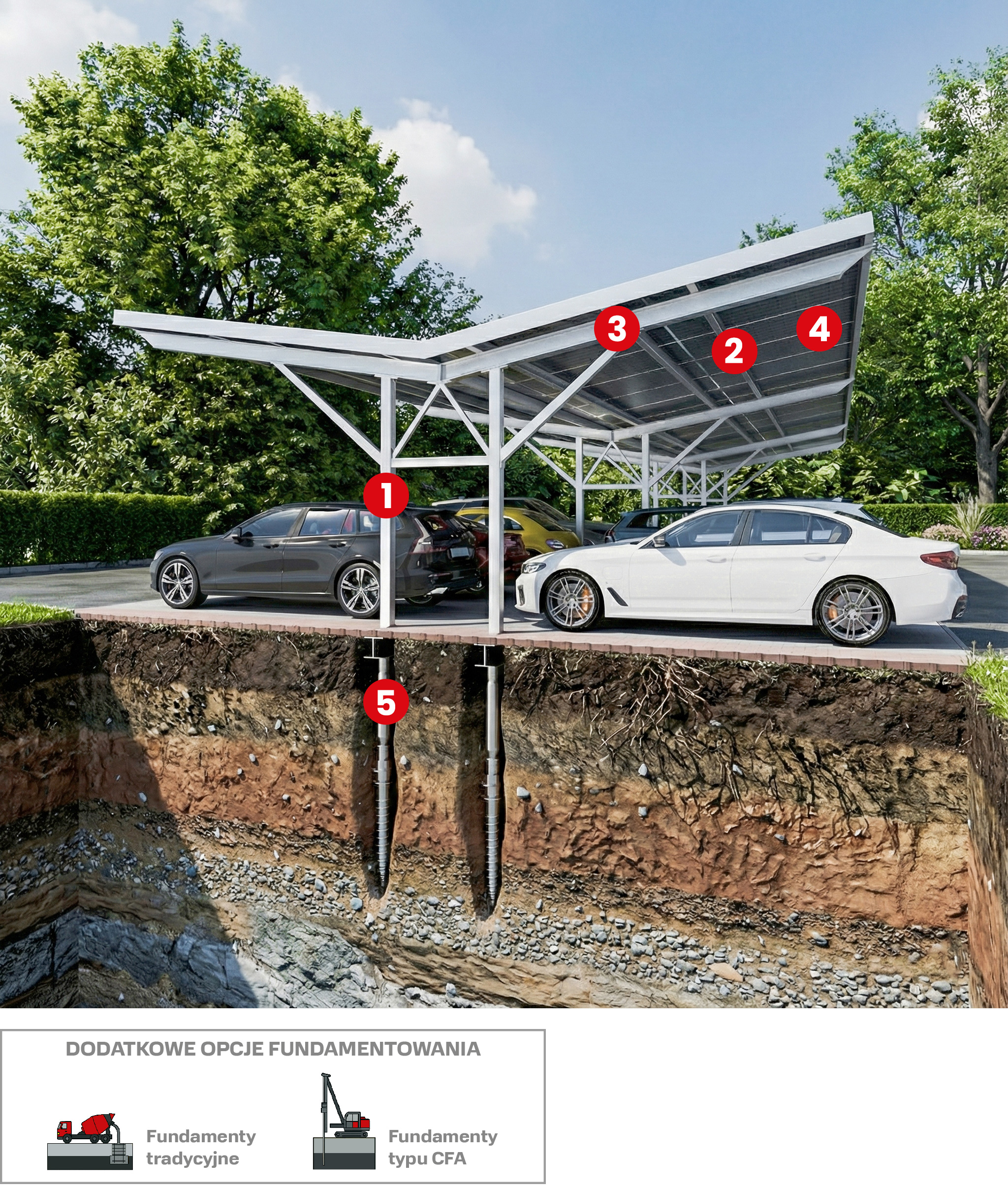 Carport można wyposażyć w: instalację fotowoltaiczną (panele PV dowolnej marki), ładowarkę do samochodów elektrycznych, system oświetlenia LED, monitoring, szczelny dach z blachą trapezową i papą, rynny i system odwodnienia, maskownice i ścianki boczne, malowanie proszkowe w kolorze RAL, fundamentowy kosz kotwiący, wkonanie fundamentów betonowych lub wkręcanych (przez podwykonawcę) oraz falownik.