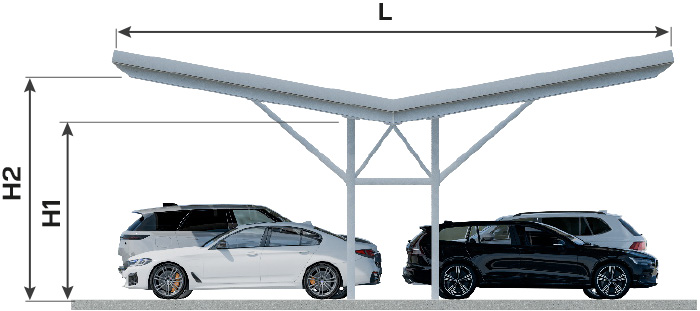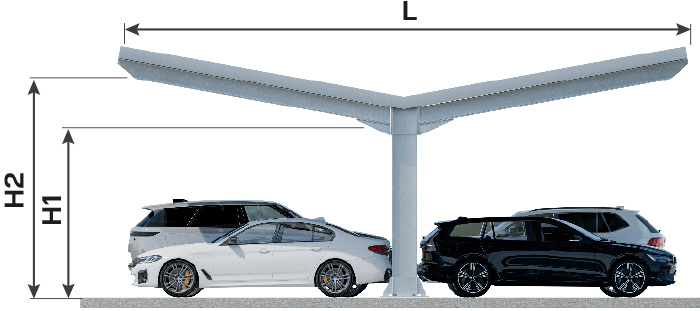 Carport typu Y-h to stalowa konstrukcja dwupodporowa, zaprojektowana do zastosowania na wielkopowierzchniowych parkingach o układzie czołowo-szeregowym. Typ ten eliminuje ryzyko kolizji drzwi pojazdów z elementami nośnymi. Zastosowanie dachu dwuspadowego umożliwia efektywne wykorzystanie paneli fotowoltaicznych.