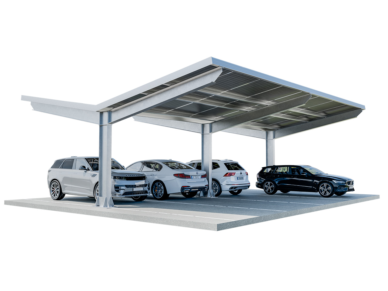 Układ dachu w Carporcie typu Y idealnie sprawdzi się na parkingach warunkujących usytuowanie paneli fotowoltaicznych w kierunku wschodnio-zachodnim, co przyczyni się do stałej produkcji energii elektrycznej przez pełen cykl dziennego nasłonecznienia.